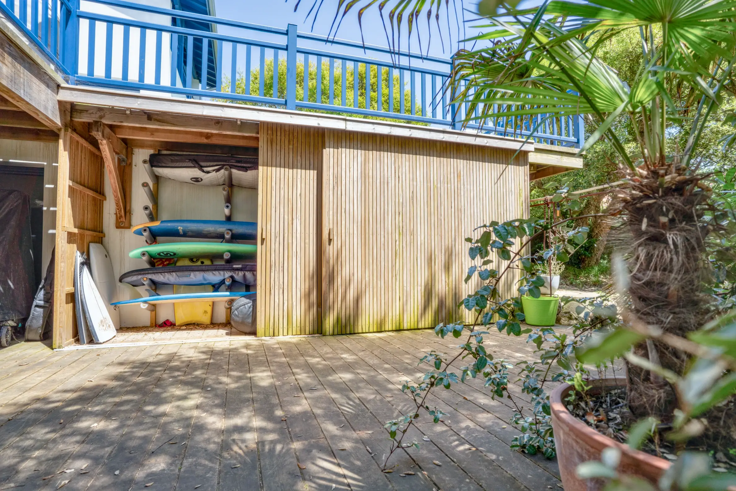 Local dédié avec douche extérieure, rangement pour planches et combinaisons